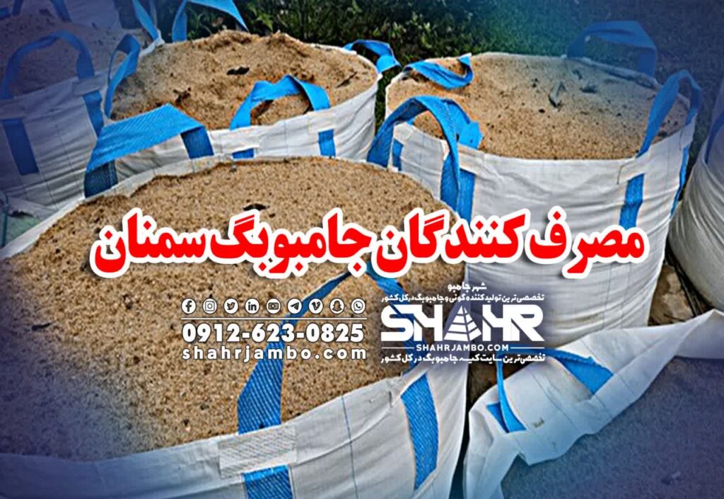 مصرف کنندگان کیسه جامبوبگ و کیسه بیگ بگ در سمنان بیشتر در معادن گچ و ژیبس فعالیت دارند و این کیسه ها برای تولیدات صادراتی خود استفاده میکنند،سلستین، زئولیت، سیلیس زینتی و سولفات سدیم سنگی، گچ و نمک از دیگر مواد معدنی موجود در استان سمنان است که از نظر تولید دارای رتبه نخست در کشور است. که تمامی این مصارف کیسه جامبو بگ و کیسه بیگ بگ را به عنوان محصول بسته بندی خود استفاده می کنند.