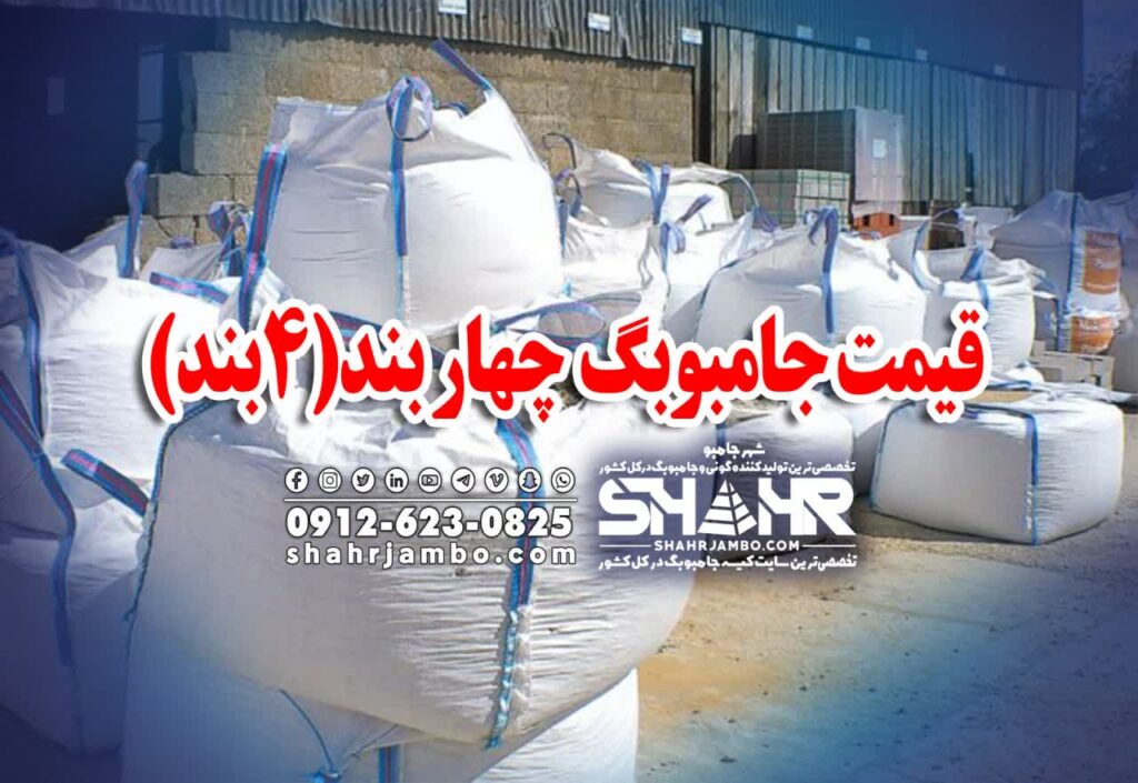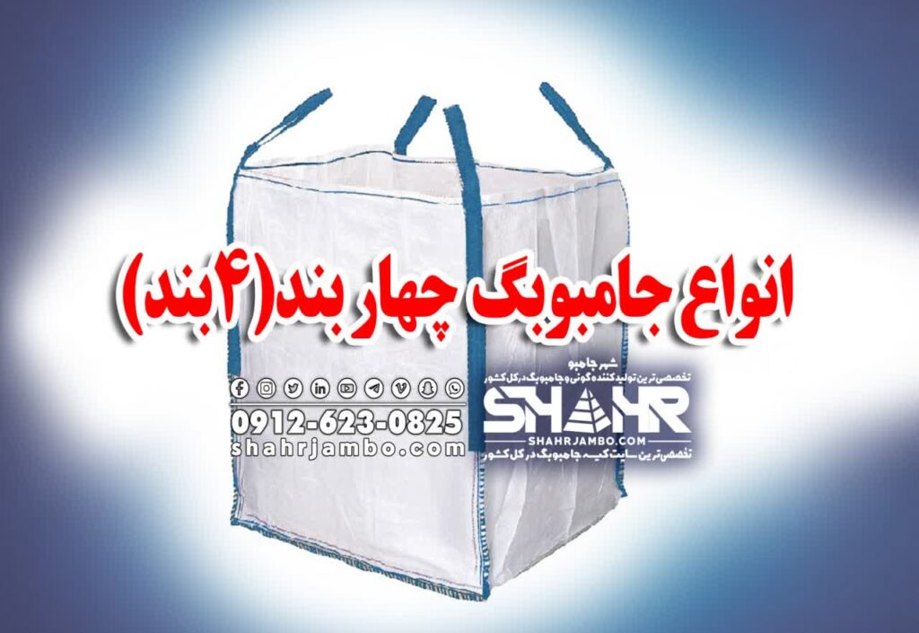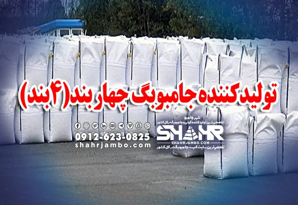 تولیدکننده کیسه جامبوبگ چهاربند (4بند) در تهران گروه کارخانجات شهرجامبو می باشد که روزانه 1500 تخته کیسه جامبوبگ قادر به تولید است. کیسه جامبوبگ های چهار بند قابلیت انعطاف پذیری را دارا هستند که برای تمامی مواد فله ای یا بسته بندی این کارایی را دارا هستند.