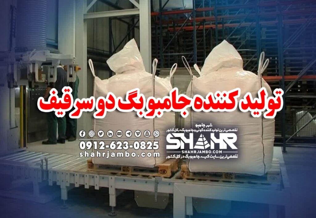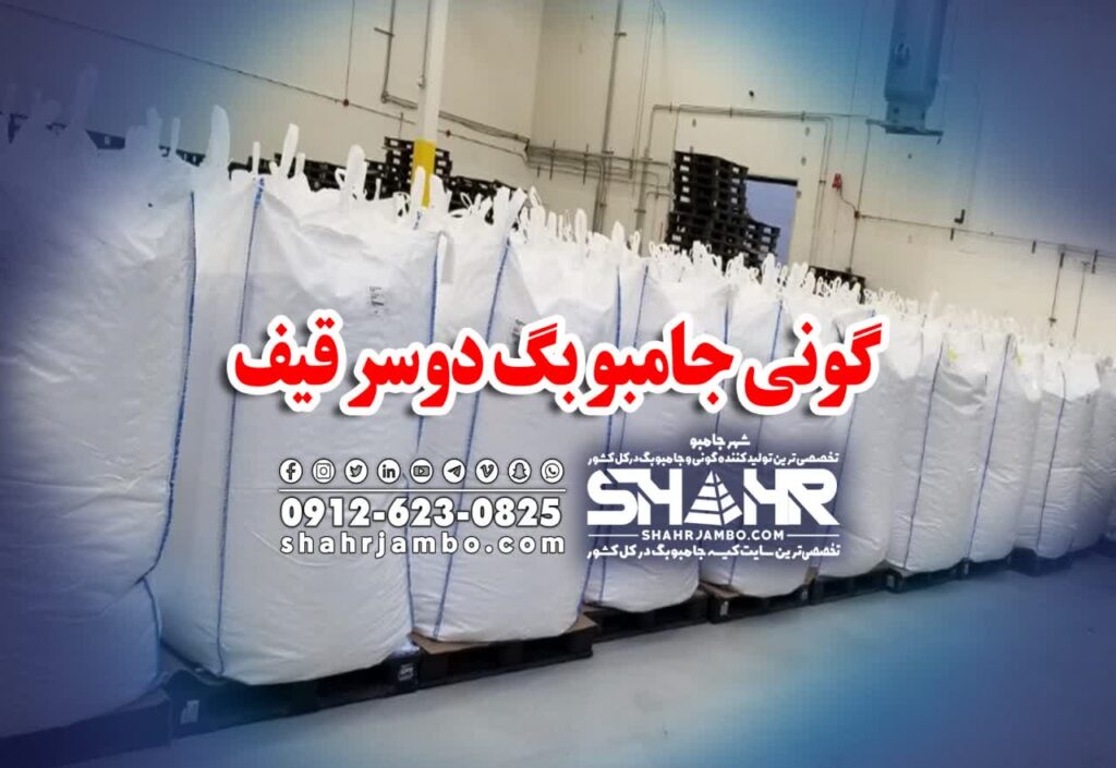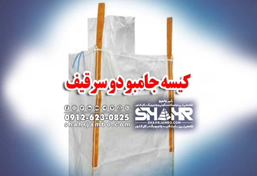 کیسه جامبو دو سرقیف کیسه جامبو دو سرقیف در دو حالت هشت بند و چهار بند تولید می شود که این کیسه جامبو ها برای مصارف یک تا سه تن مصرف می شوند که تمامی متریال های بکار گیری شده در هر مواد و در صنعتی مورد استفاده قرار می گیرد، این کیسه جامبو با بهترین نخ و و بهترین پارچه های روز دنیا و ایران تولید می شوند.